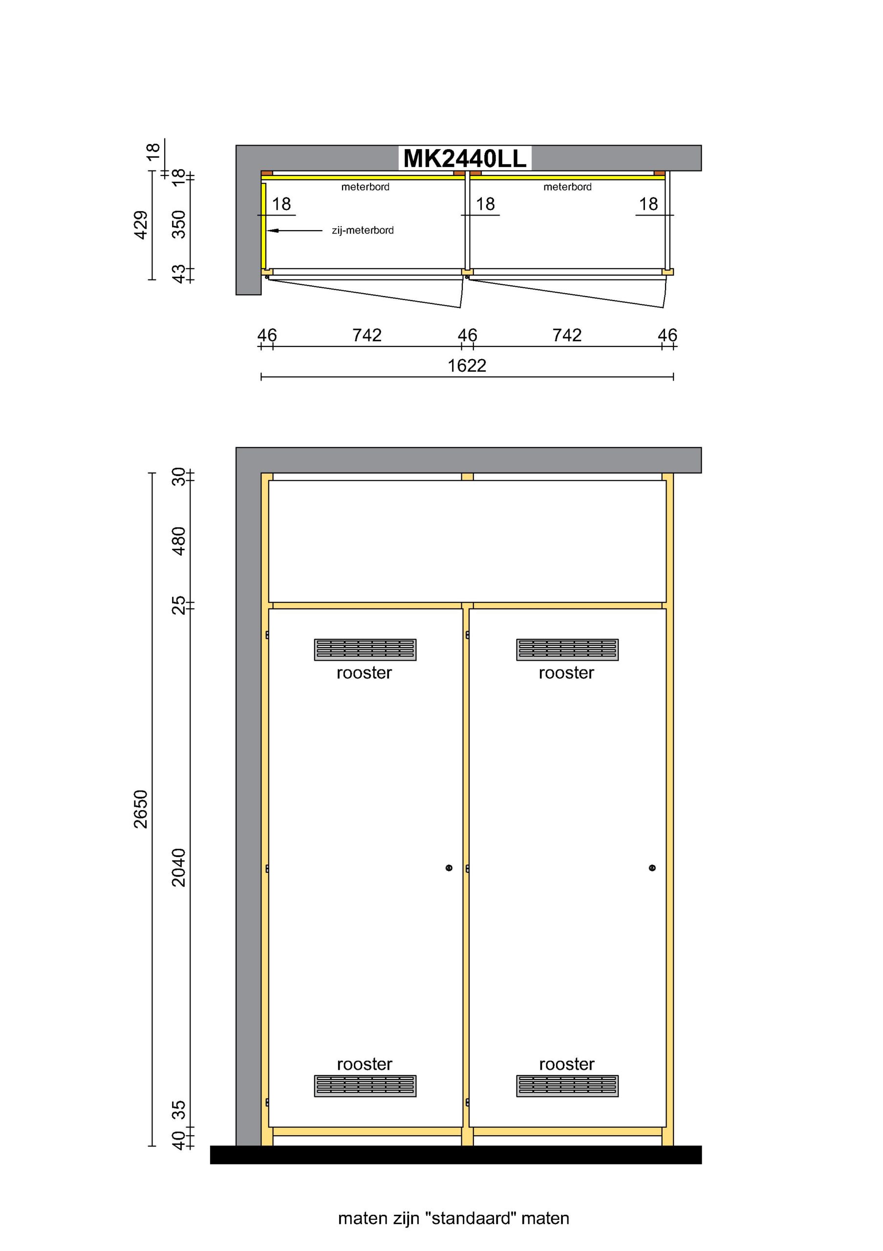 De MK2440LL is een hoekkast waarbij de zij- en tussenwand worden meegeleverd. Het meterbord, zijmeterbord en de meterbordspouwlatten moeten los besteld worden.