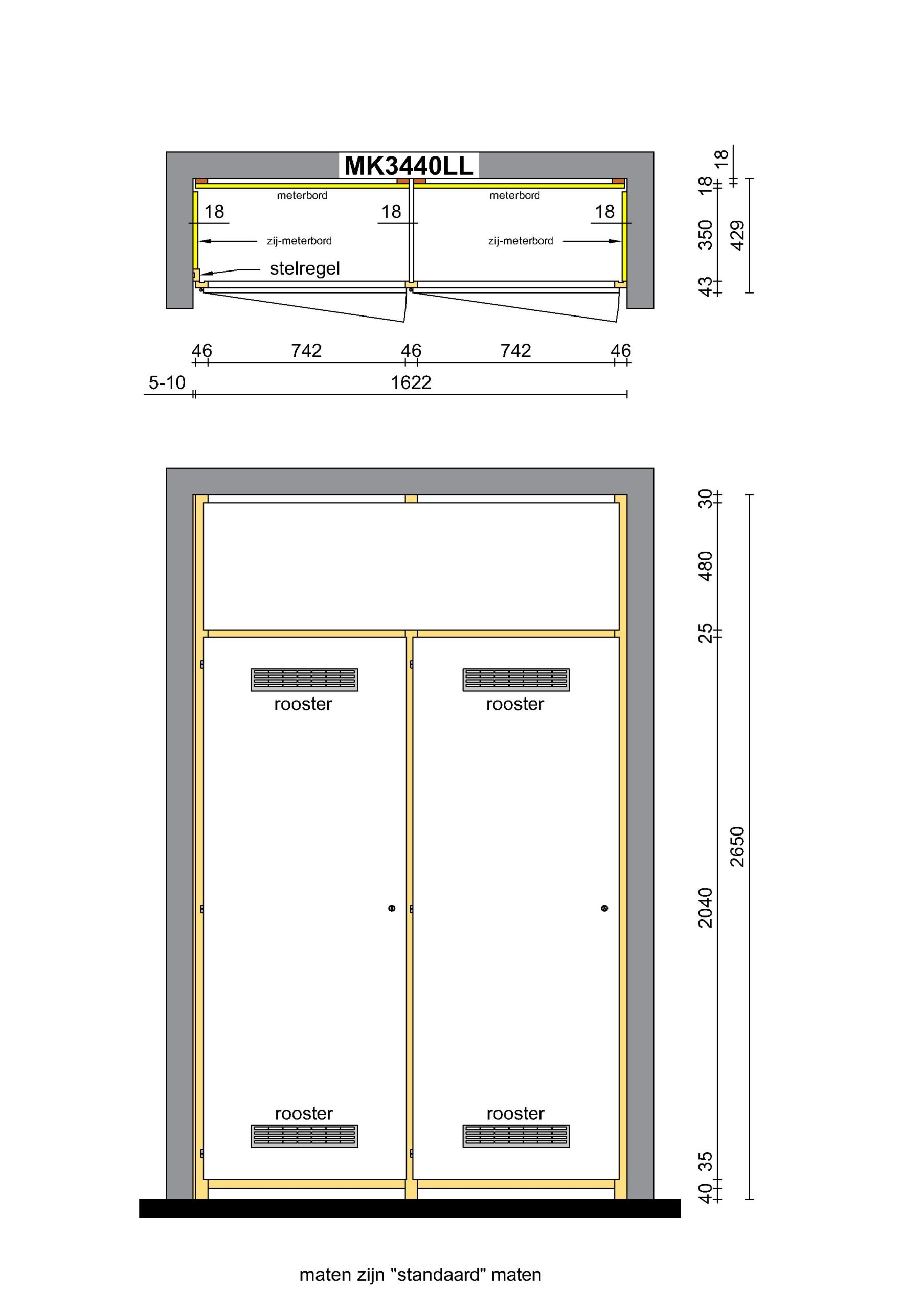 De MK3440LL is een meterkast voor een nis waarbij de tussenwand wordt meegeleverd. Het meterbord, zijmeterbord, de stelregel en de meterbordspouwlatten moeten los besteld worden.